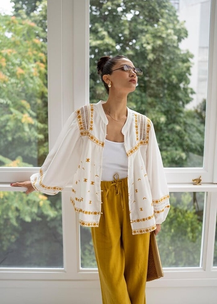 Beyaz pamuklu nakışlı bluz gömlek