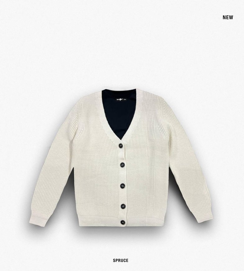 Beyaz pamuklu örgü hırka, yuvarlak yaka ve uzun kollu, rahat kesim. Midi boy, düğmeli ve SPRUCE markalı. Günlük sokak tarzına uygun S.M.L.XL. bedenleri mevcuttur