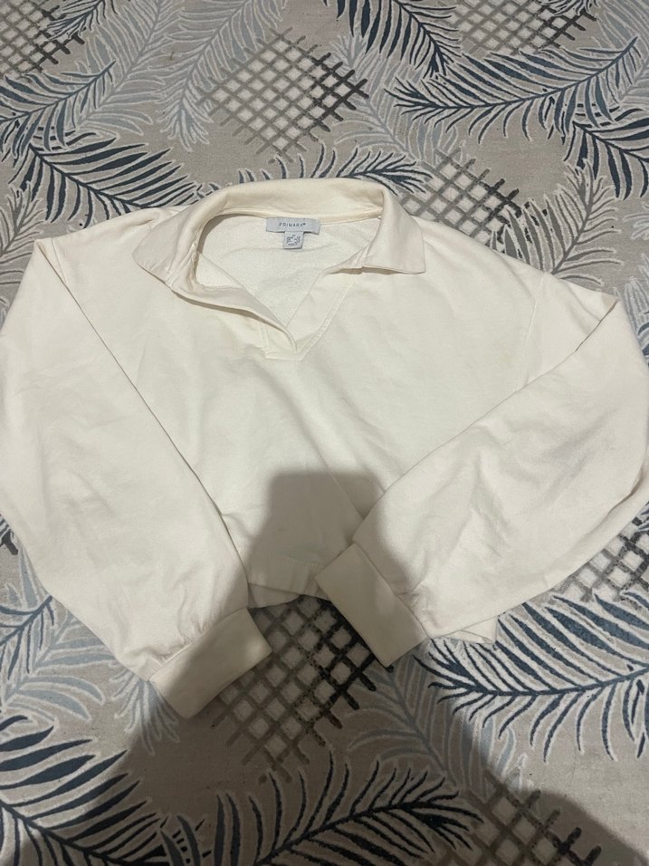 Beyaz pamuklu sweatshirt, polo yaka ve uzun kolludur. Rahat, bol kesim yapısıyla günlük kullanım için uygundur.
