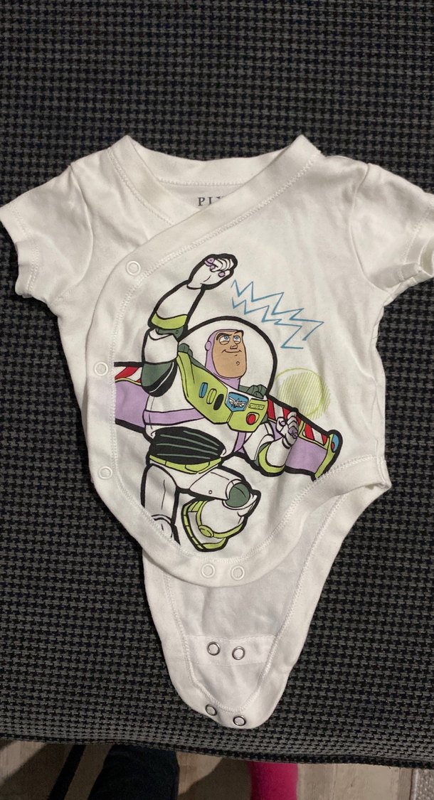 Beyaz pamuklu, renkli baskılı pop kültür temalı bebek body. Kısa kollu, yuvarlak yaka ve çıtçıtlı kapanışlıdır.