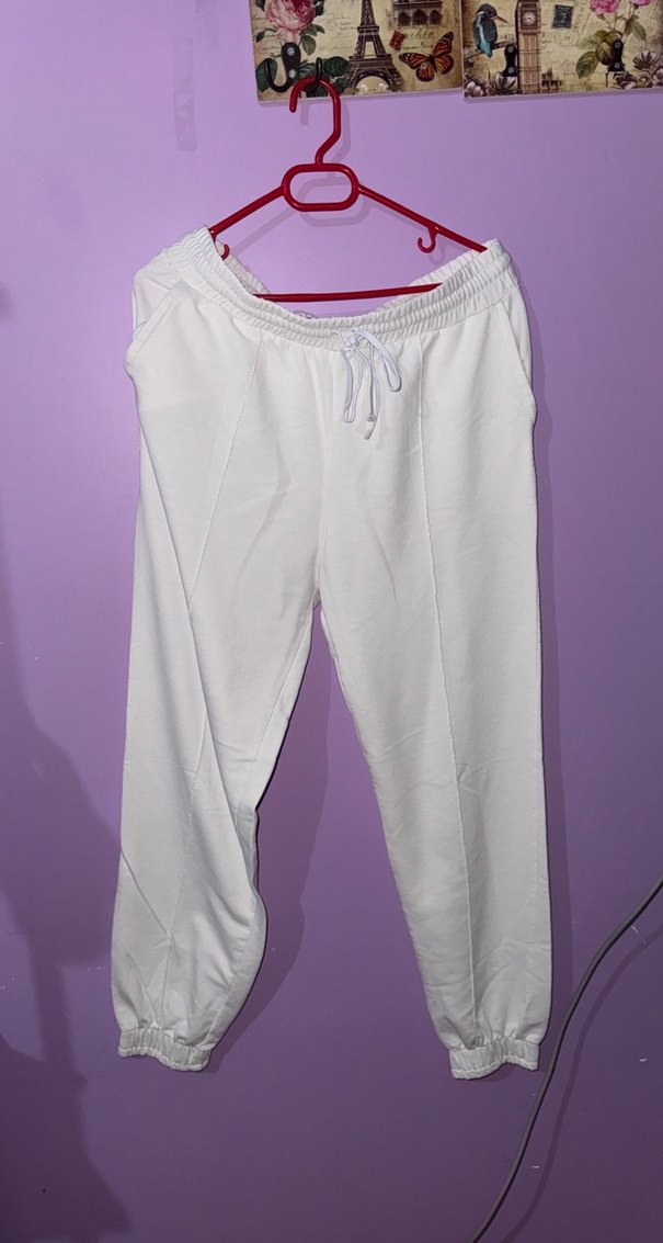 Pamuklu, beyaz, rahat kesim, orta boy uzunlukta, lastikli bel ve paçalarla spor ve günlük sokak modası için uygun kadın eşofman altı. ♀️