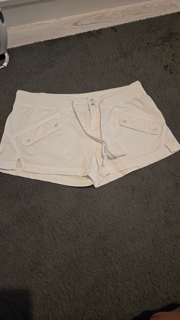 Beyaz pamuklu mini şort, rahat kesimi ve sokak stiliyle, ön cepler ve bağcıklı bel detayıyla dış mekanlar için zahmetsiz şıklık sunar.