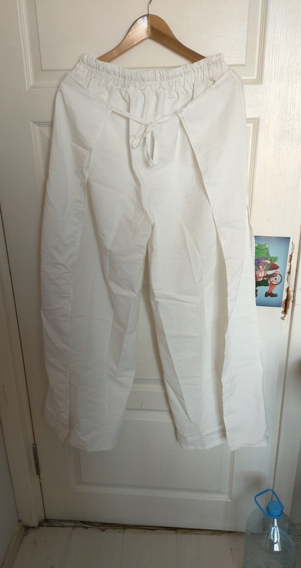 Beyaz pamuklu kumaştan, salaş kesim ve drapeli tasarıma sahip, lastikli bel detaylı kadın pantolon. Minimalist ve günlük kullanıma uygun.