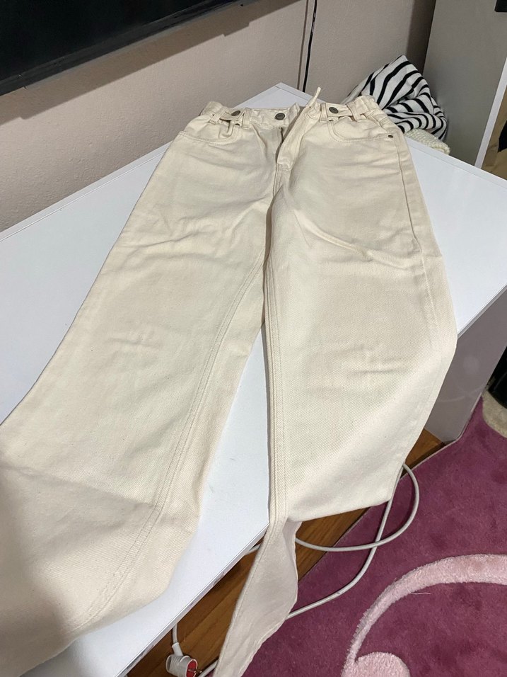 Bu beyaz pamuklu jean, salaş kesimi ve midi boyuyla günlük kullanım için rahat ve şık bir tarz sunar.