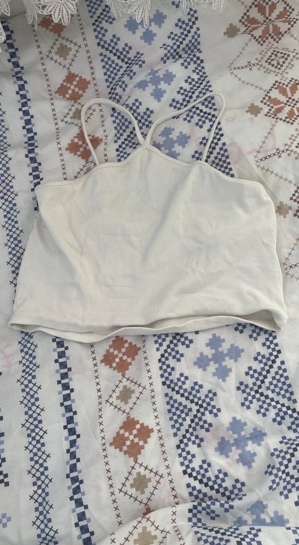 Beyaz pamuklu, straplez ve kolsuz, vücuda oturan kadın atlet. Minimalist, bohem ve retro tarzına uygun, günlük kullanıma rahat ve şık.