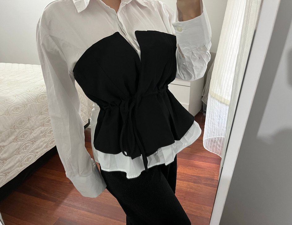 Beyaz pamuklu gömlek, straplez yaka, askılı kollu ve kemerli tasarımıyla midi boyda, regular fit ve Paris sokak stiline uygun, ofis kullanımı için ideal.