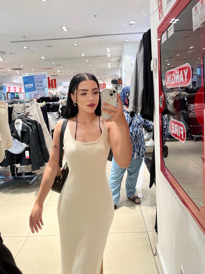 Beyaz pamuklu, straplez yaka ve kolsuz tasarıma sahip, normal boy midi elbise. Günlük kullanıma uygun, sade ve şık bir görünüm sunar.