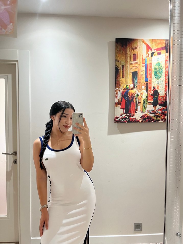 Pamuklu kumaştan, beyaz ve straplez tasarımlı, vücuda oturan midi elbise. Minimalist ve rahat şıklık sunar, spor ve günlük kullanıma uygundur.