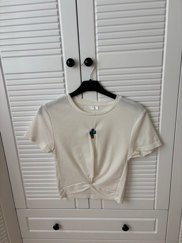 Kısa kollu, yuvarlak yakalı, düğmeli beyaz pamuklu tişört. Hafif baskılı, dar kesim ve sokak stiline uygun.