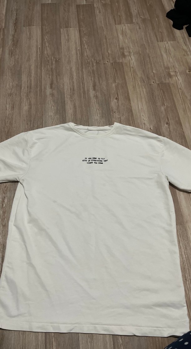 Beyaz pamuklu Unisex tişört, kısa kollu ve yuvarlak yaka, bol kesim. baskılı tasarım, günlük kullanıma uygun. Bir harfi eksik