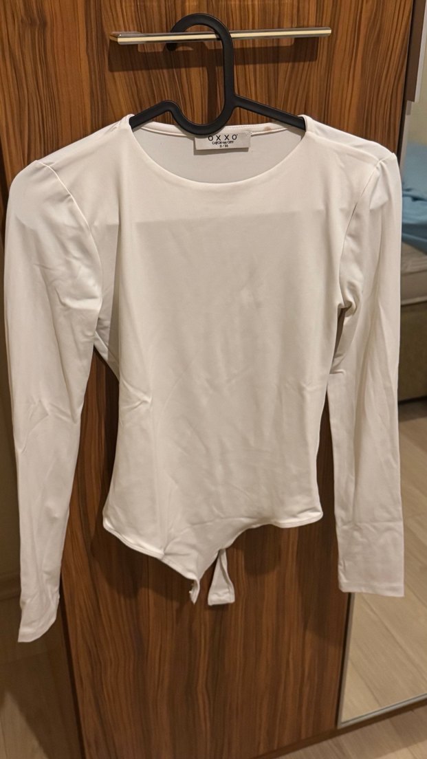 Pamuk kumaştan yapılmış, uzun kollu ve yuvarlak yakalı beyaz, vücuda oturan basic bluz. Minimal ve zahmetsiz şıklık sunar, günlük sokak stili için uygundur. Sadece denendi