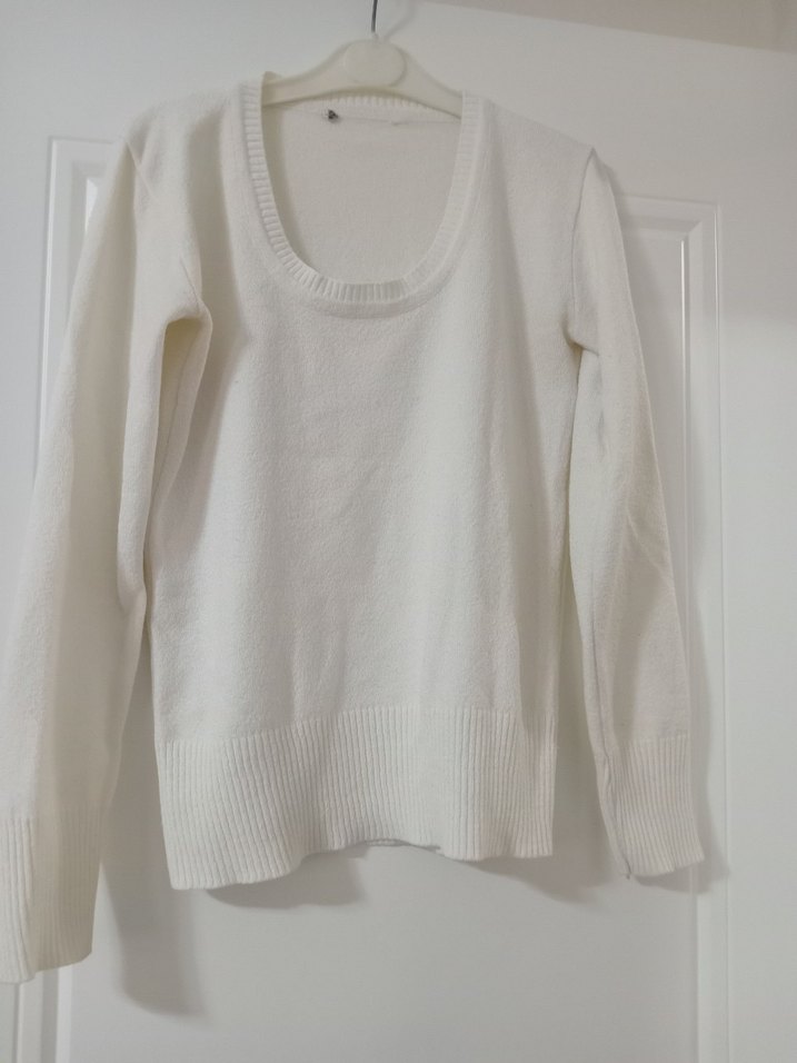 Beyaz pamuklu, uzun kollu, yuvarlak yaka ve rahat kesim basic kazak, günlük sokak stili için minimal tasarımlı.