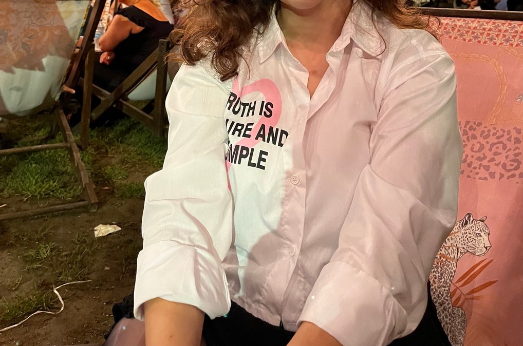 Beyaz pamuklu gömlek, uzun kollu ve düğmeli. Bol kesimli, baskılı pastel pembe kalp ve yazı detaylı. Trendy ve rahat günlük kullanım için uygun.