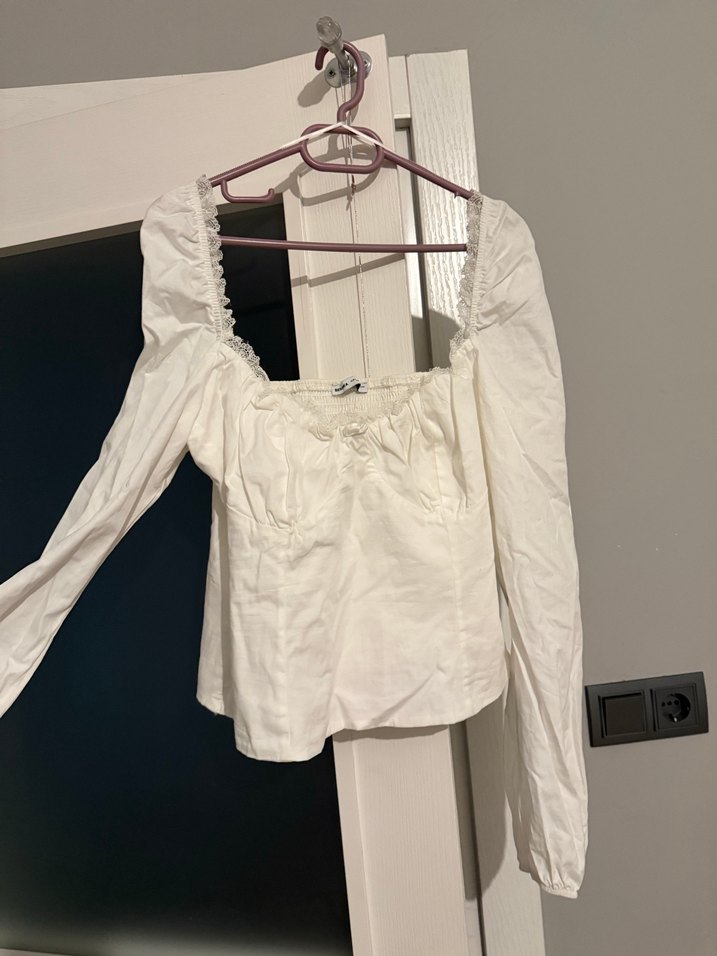 Beyaz pamuklu kumaştan, uzun kollu ve hem yakasında hem sırtından lastiği mevcut. Hem madonna yaka hem normal yaka kullanılabilir. Hiç giymedim. Orijinal marka defosuz . Hem şık hem günlük kullanılabilir
