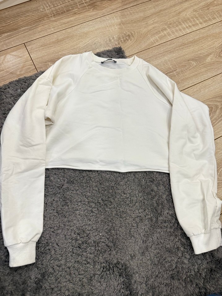 Pamuk kumaştan, uzun kollu ve yuvarlak yakalı beyaz sweatshirt. Bol kesim ve kısa boyuyla rahat ve şık bir günlük tercih.