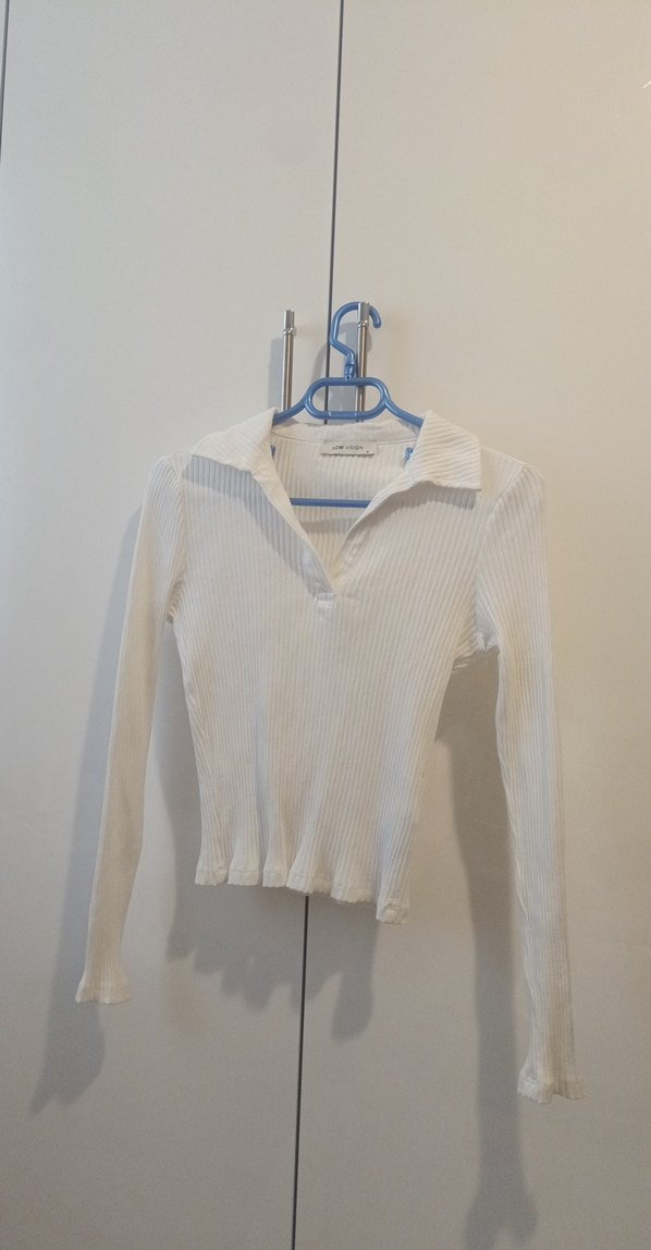 Beyaz pamuklu kumaştan, uzun kollu ve yakalı, dar kesim rahat bir kazak. Günlük kullanıma uygun, şık ve sade bir tasarım.