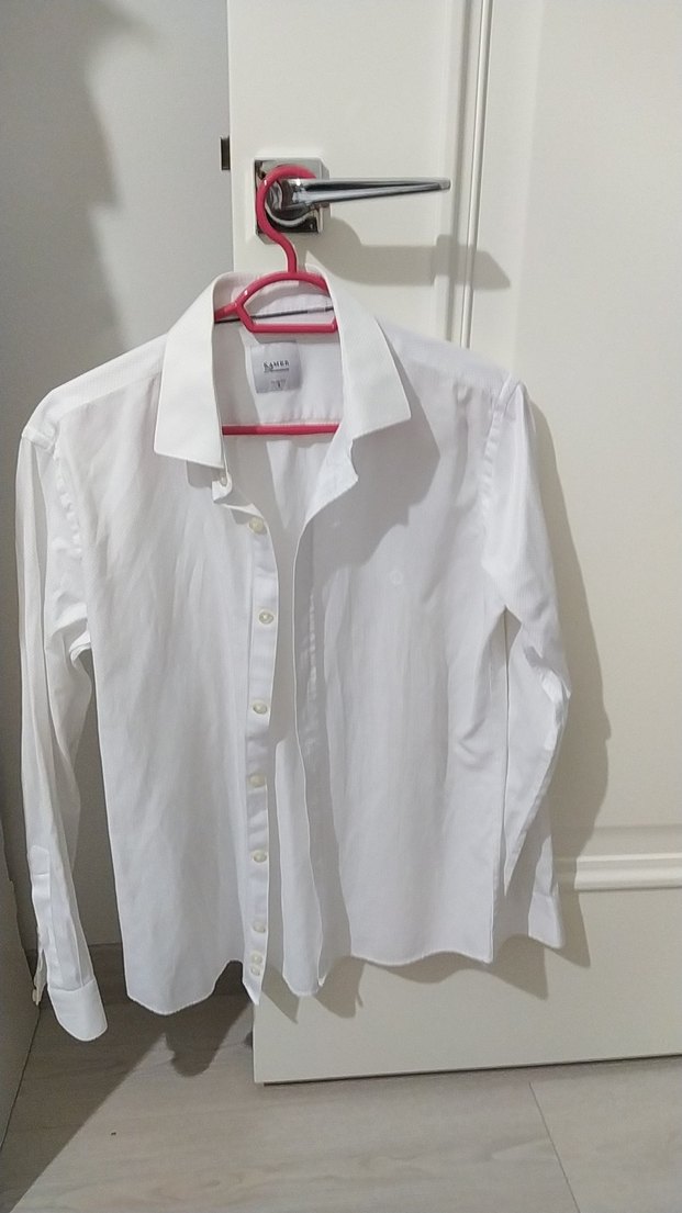 Beyaz renkli, pamuklu kumaştan yapılmış, düğmeli ve klasik yaka detaylı uzun kollu erkek gömleği. Ofis kullanımı için uygundur.