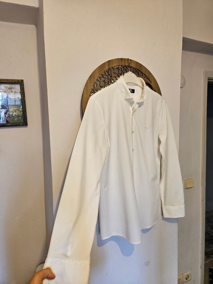 Beyaz pamuklu erkek gömlek, yakalı ve uzun kolludur. Düğmeli manşetleri ve normal kesimiyle günlük rahat kullanıma uygundur. Minimalist, desensiz tasarıma sahiptir.