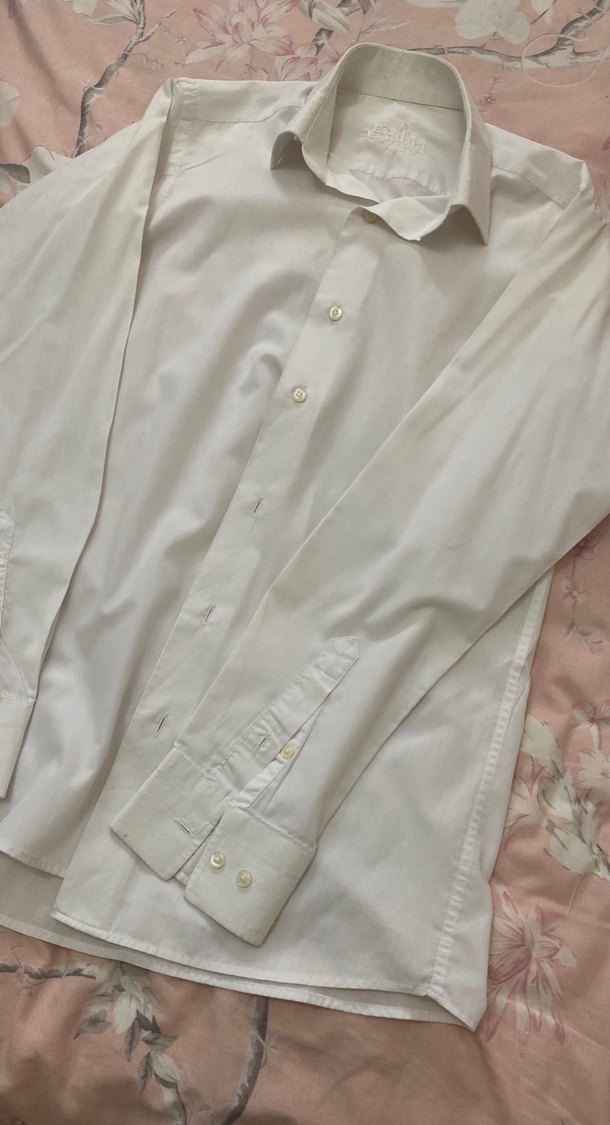 Beyaz pamuklu erkek gömlek, yakalı ve düğmeli. Uzun kollu ve regular fit kesimiyle ofis için uygun, sade ve temel bir görünüm sağlar.