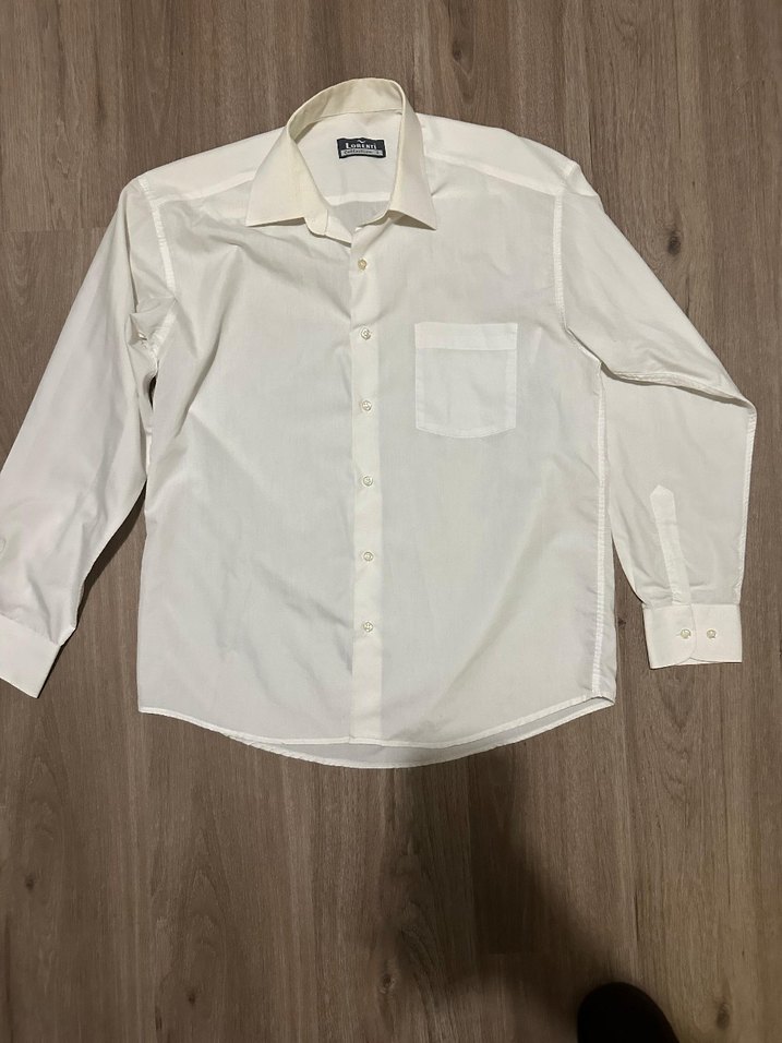 Uzun kollu, yakalı ve düğmeli ön cep detaylı erkek gömleği. Pamuklu, regular fit ve beyaz renkte, ofis kullanımı için uygun. Lorenti Beyaz Gömlek L beden kolunda ufak lekesi vardır yıkayınca geçecektir