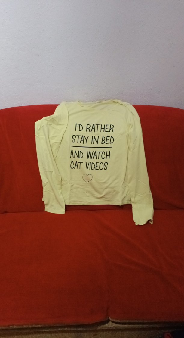 Beyaz pamuklu hamile tişörtü, uzun kollu ve yuvarlak yakalıdır. Bol kesim ve 'I'd rather stay in bed and watch cat videos' yazılı baskısı vardır. Günlük rahat kullanım için uygundur.