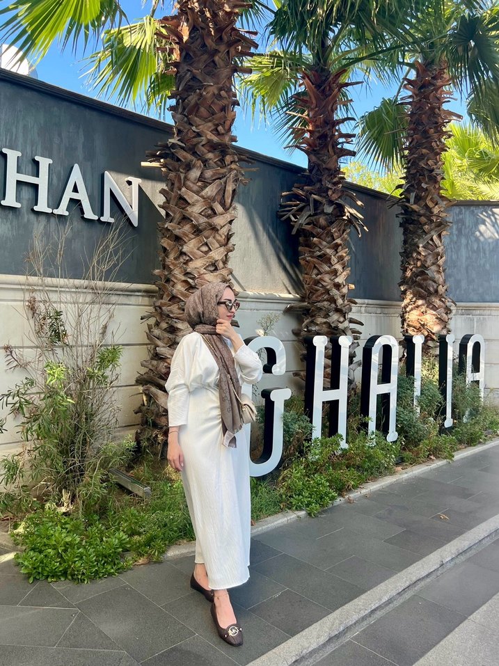 Beyaz pamuklu uzun elbise, yüksek yakalı, askılı kolları ve salaş kesimi ile etnik desenlere sahip. Günlük kullanım için uygundur. Bi kere giyilmiştir deforme yoktur