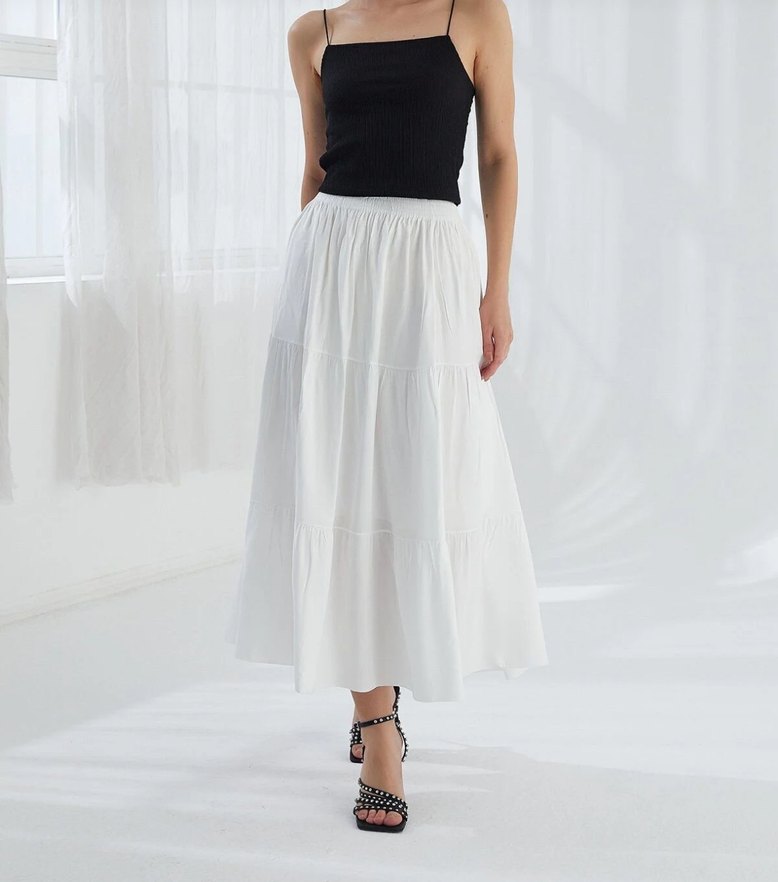 Beyaz pamuklu uzun etek, salaş kesimi ve sade tasarımıyla minimal ve bohem stil sunar. Günlük kullanıma uygundur.