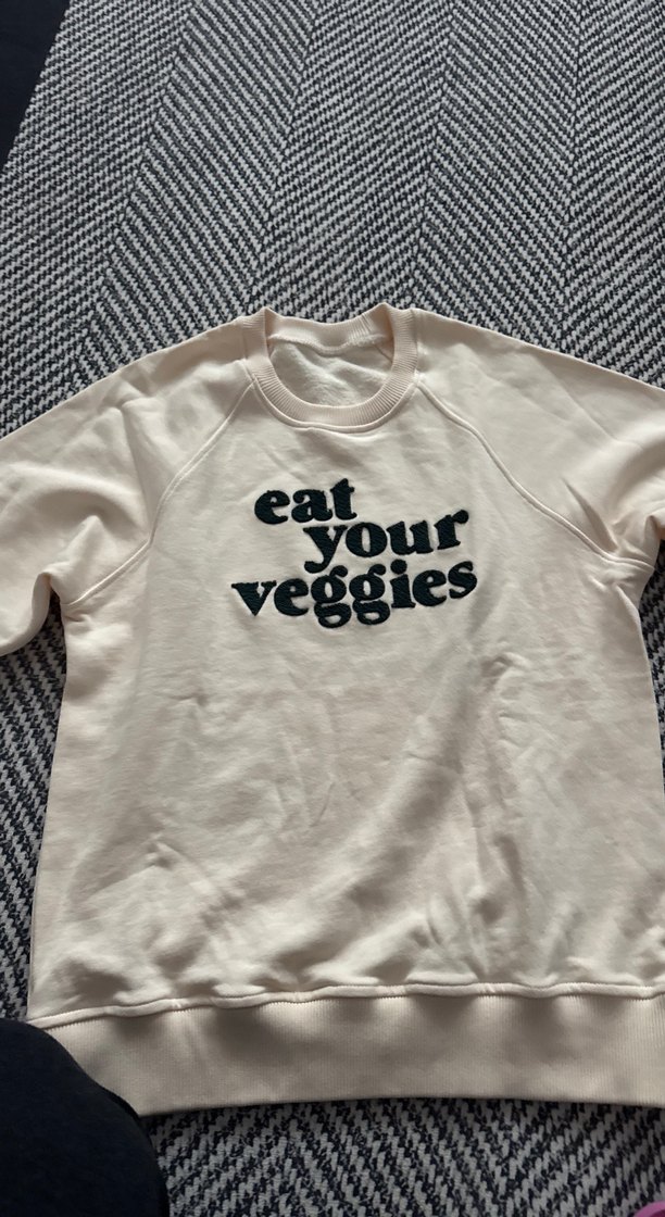 Beyaz pamuklu, yuvarlak yakalı, uzun kollu, bol kesim ve örme dokulu sweatshirt. Önünde 'eat your veggies' yazısı baskılıdır. Rahat sokak stiline uygundur.