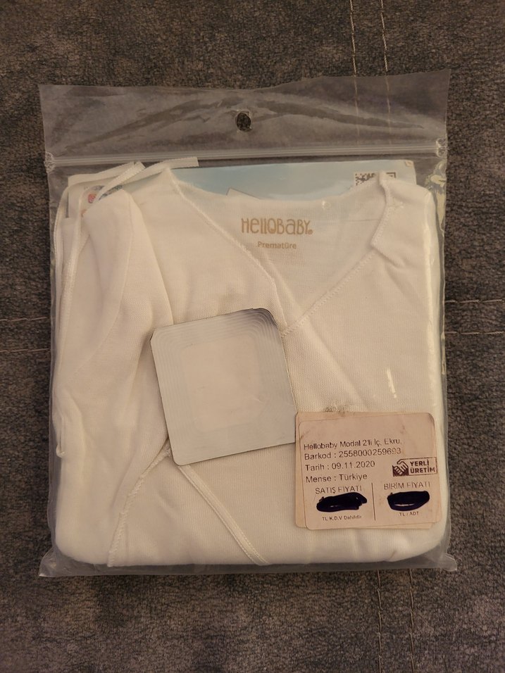Beyaz pamuklu hastane tulumu, kısa kollu ve fermuarlı ön kısmıyla kolay kullanım sağlar. Yenidoğanlar için yumuşak ve rahat bir üründür.