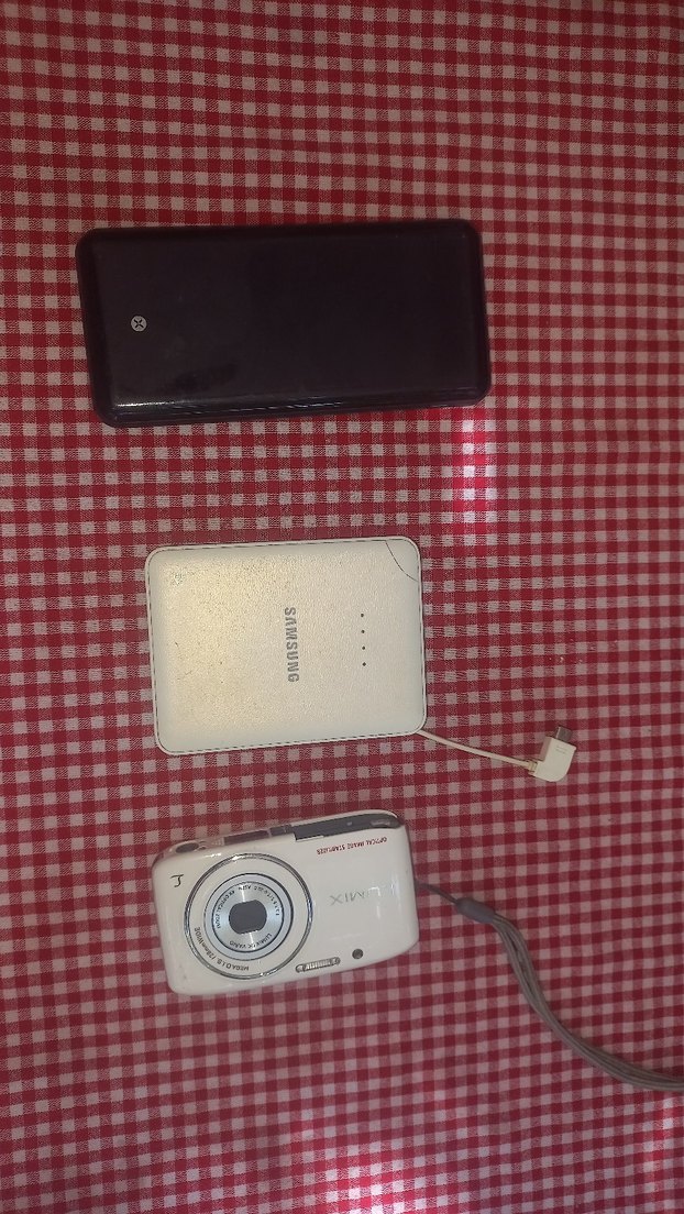 Beyaz Panasonic Lumix Dijital Kamera ve Samsung Powerbank