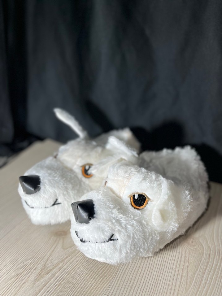 Beyaz renkte, gri leopar desenli, kürk detaylı, yumuşak ve sıcak kumaştan erkek çocuk ev terliği.