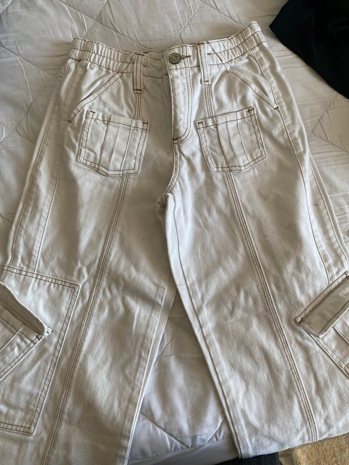 Salaş kesim, kemerli beyaz keten pantolon, ön cepleriyle günlük sokak stili için uygundur. lekesi vardır