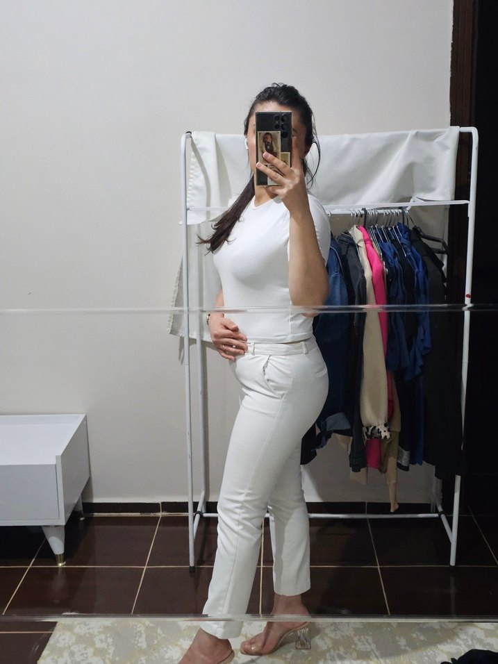 Pamuklu kumaştan üretilmiş, beyaz, vücuda oturan Midi boyu ve sade tasarımıyla günlük kullanıma uygun şıklık sunar. paçasını kendime göre kısalttım açılabilir dikişi içerde gizli 155 boy 56 kiloda duruşudur
