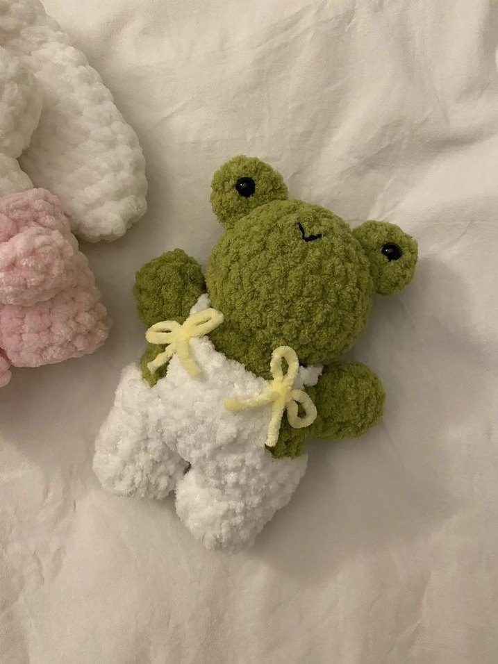 Yumuşak dokulu, pastel renkli peluş kurbağa oyuncak, beyaz pantolon ve sarı fiyonk detaylarına sahip. Siyah gözleriyle sevimli görünüyor.