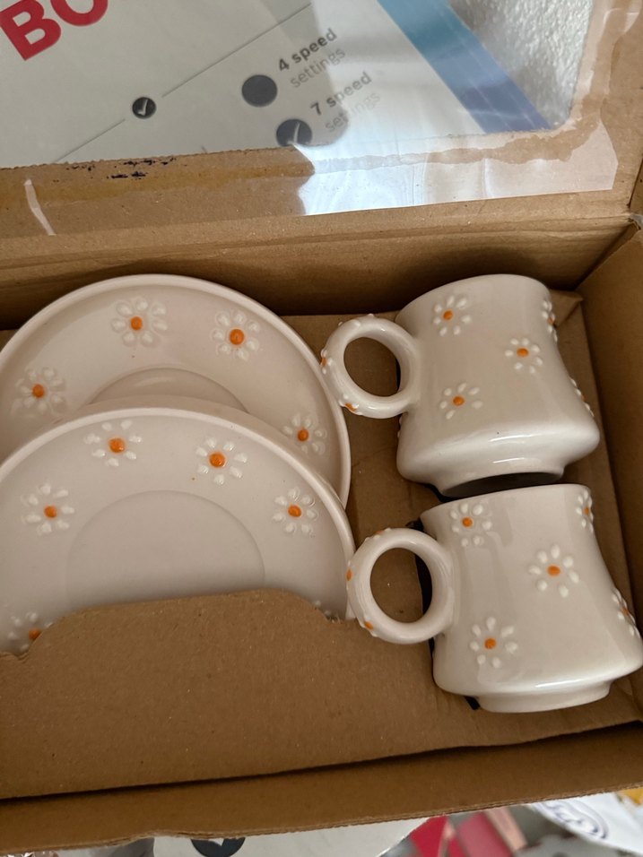 Pastel tonlarda küçük papatya desenleriyle süslenmiş, kulplu iki beyaz fincan ve tabak seti.
