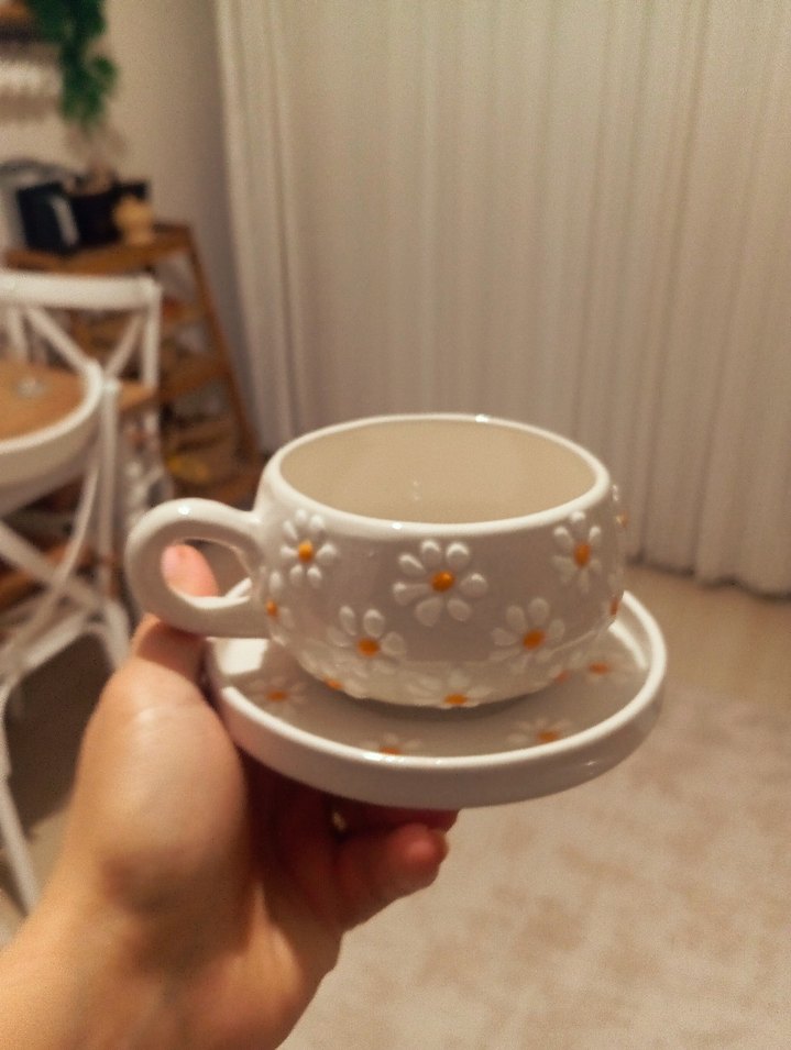 Pastel papatya desenli beyaz seramik fincan ve tabağı, sıcak içecekler için uygun.