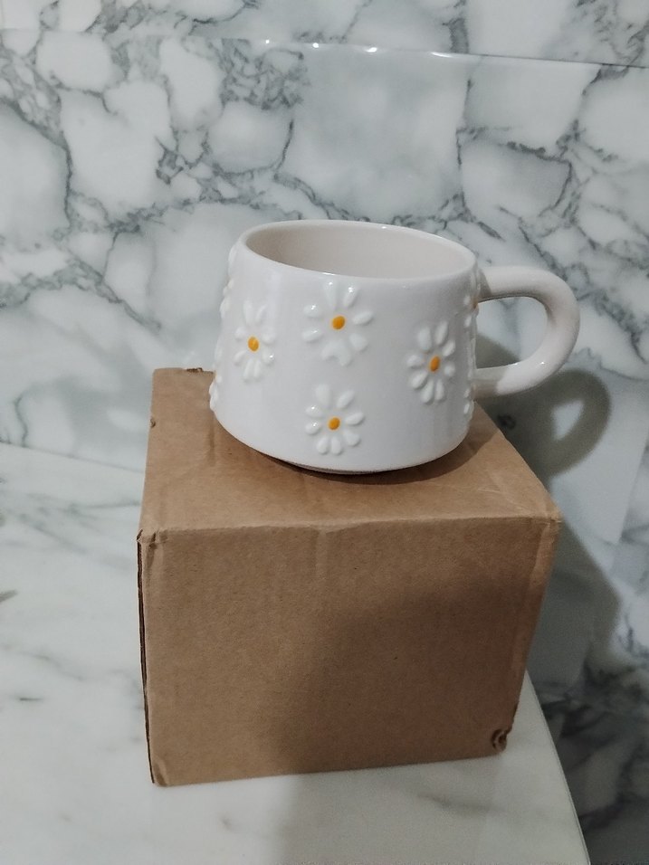 Beyaz seramik kupada kabartma papatya desenleri ve pastel sarı detaylar bulunur, zarif ve hoş bir görünüm sunar. ☕