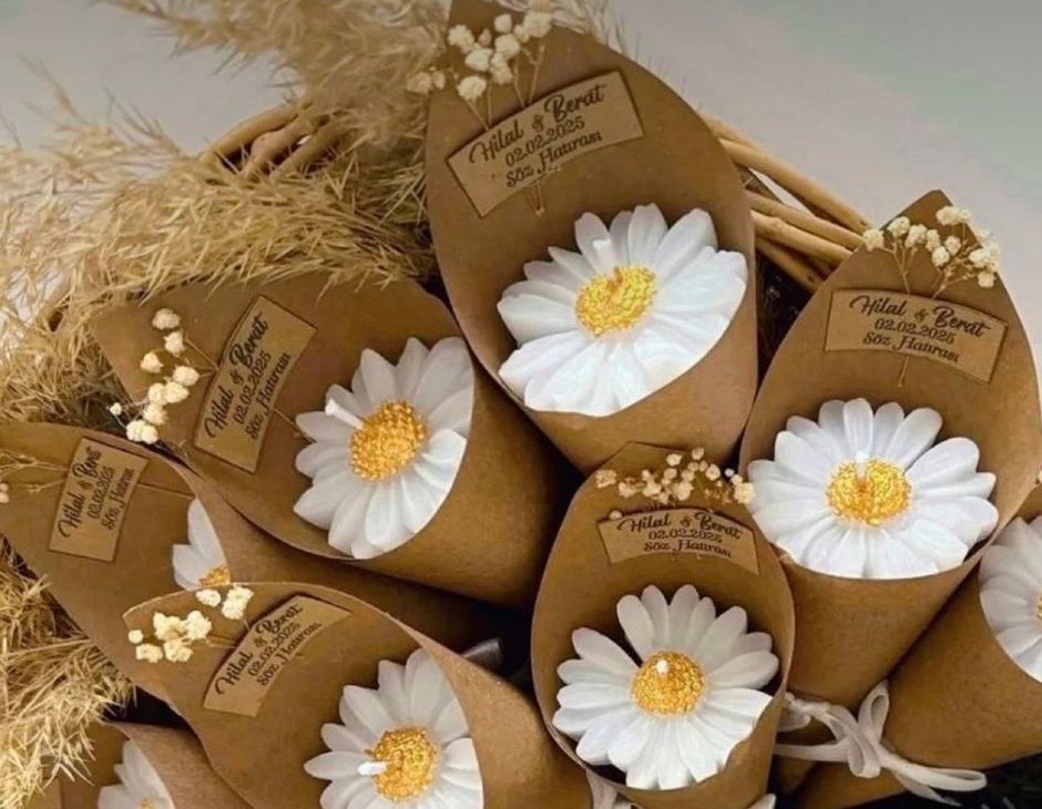 Kahverengi kağıda sarılı, kişiye özel etiketli, hafif beyaz papatya şeklinde kokulu mumlar. Dekorasyon veya hediye için uygun. Toplu sipariş alınır