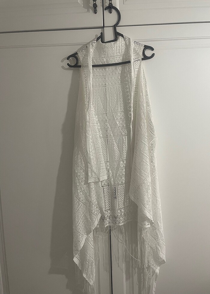 Bi kaç kez giydim sağlam ve temizdir arkası önden bi tık kısa model saçaklı yelek tarzında s-m bedenliler kullanabilir beyaz renk