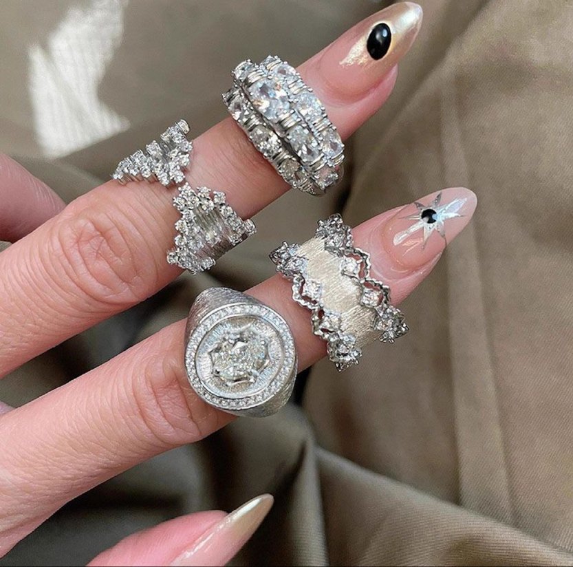 Pullu detaylara sahip desenli beyaz yüzük seti, göz alıcı ve avangart tarzlar için uygundur. ✨