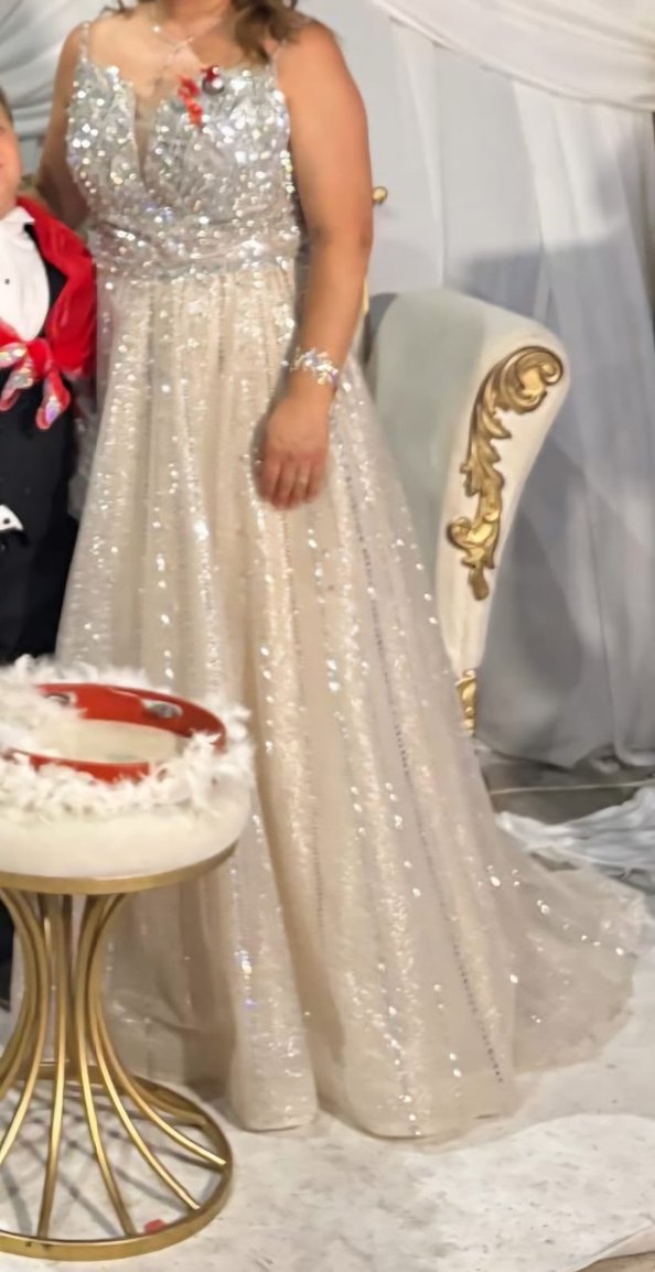 Uzun, beyaz ve vücuda oturan bu gelinlik, straplez kesim ve parıltılı desenli kumaşıyla klasik ve gösterişli bohem tarzı sunar. ✨
