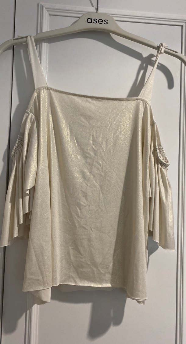 Parlak beyaz keten kumaştan, askısız ve salaş kesim bluz. Drapeli detaylara sahip, midi boyda ve bohem tarzda parti için uygun.