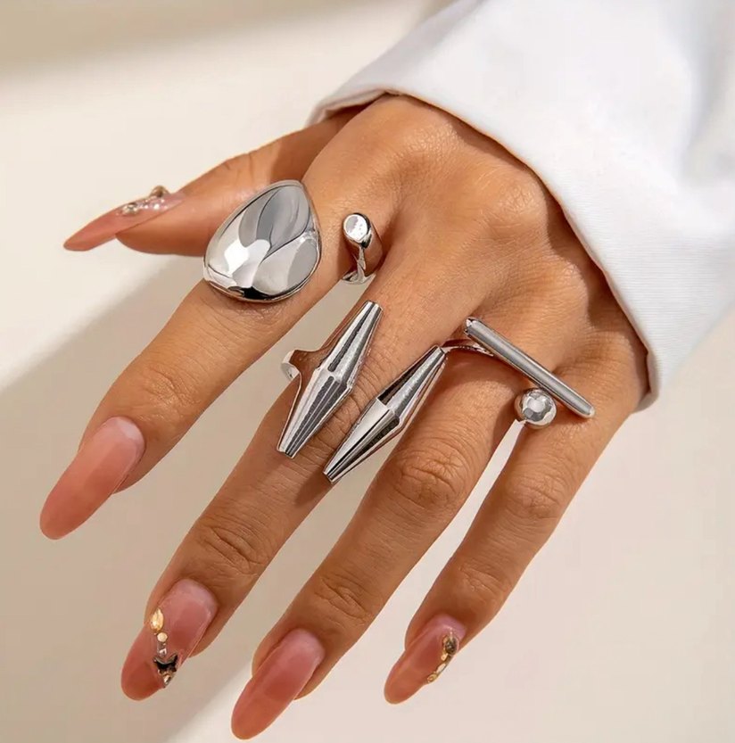 Beyaz parlak, avant-garde şekillere sahip yüzük seti, günlük kullanım için zahmetsiz şıklık sunar. Desensiz tasarımı çağdaş tarzı vurgular.