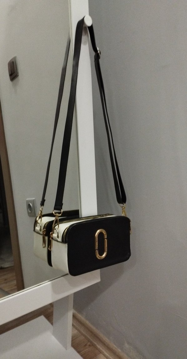 Beyaz parlak deri çapraz çanta, baskılı desen ve tokalı detaylarla cesur ve çağdaş bir stil sunar.
