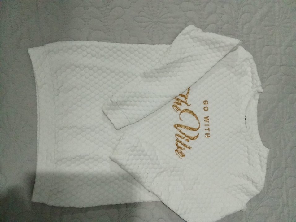 Beyaz, parlak baskılı ve "GO WITH" yazılı kazak