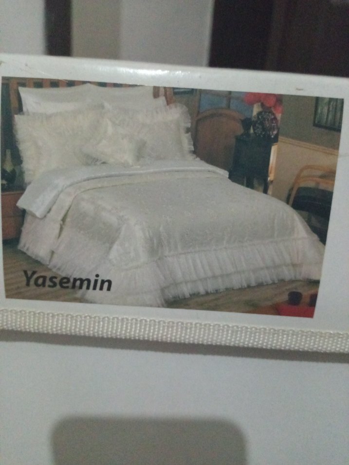 Beyaz, parlak baskılı desene sahip Yasemin isimli yatak örtüsü, yatak odasına zarif bir dokunuş katıyor. ️
