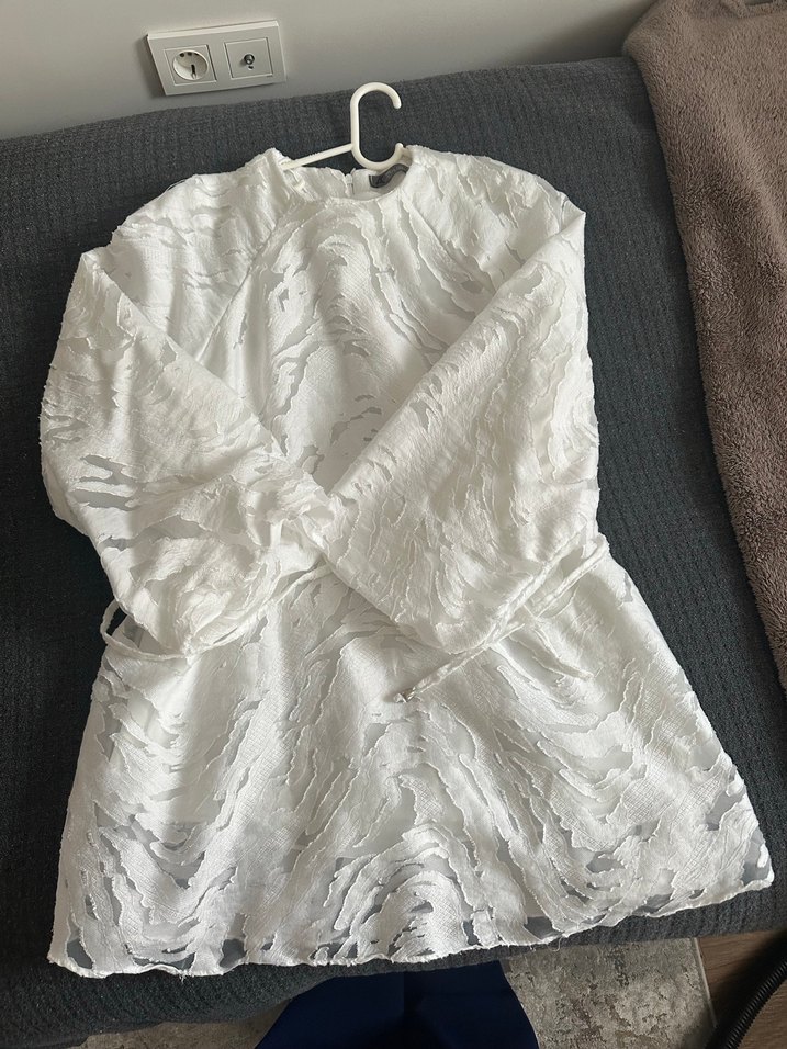 Beyaz, parlak dokulu kumaştan, uzun kollu, bol kesim ve midi boyda, rahat bohem stilinde kadın elbisesi.
