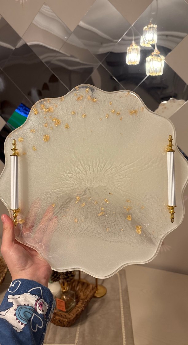 Altın detaylı, beyaz parlak bohem tarzda tepsi, şık kulplarıyla sunuma uygun. ️