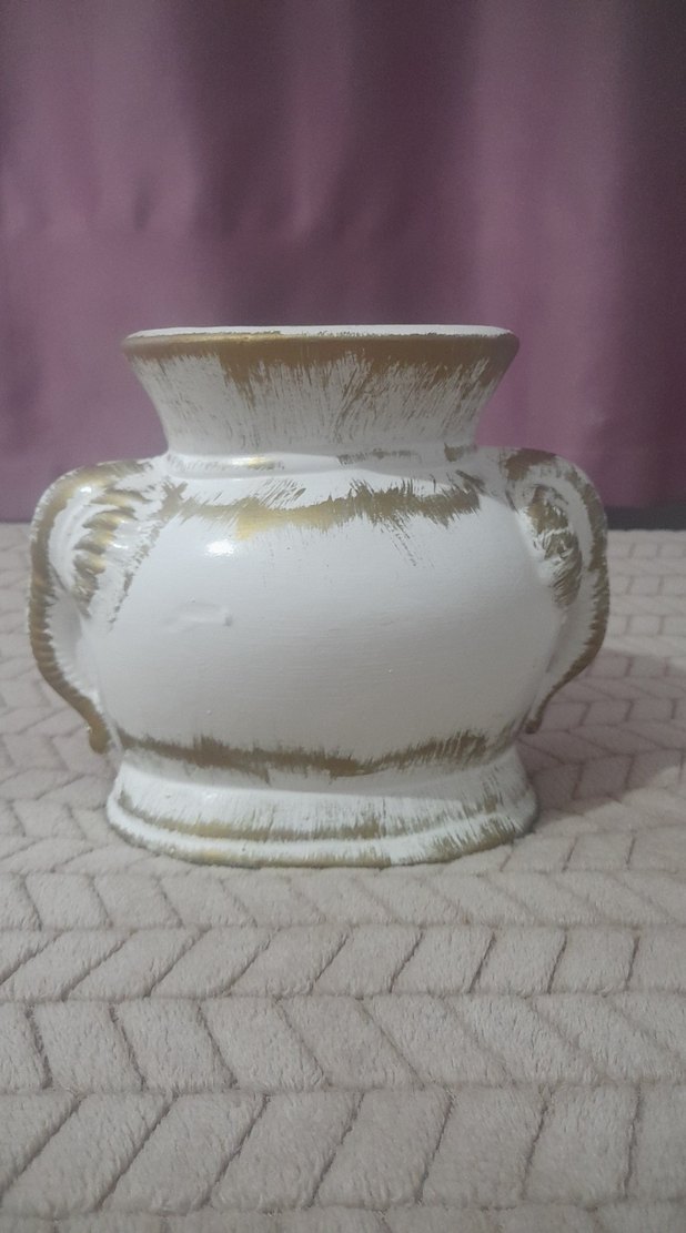 Dokulu tasarıma sahip beyaz parlak dekoratif vazo, zarif görünüm için hafif aşınmış altın detaylar içerir.