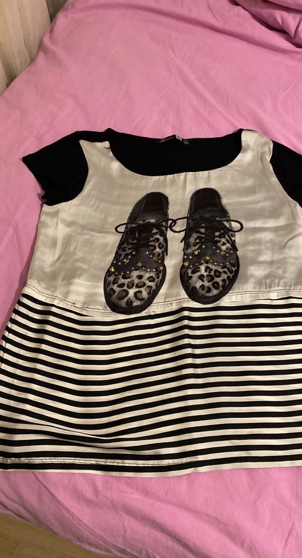 Beyaz parlak kumaş üzerine leopar desenli ayakkabı baskısı ve siyah beyaz çizgili alt kısmı olan bol kesim üst. Kısa kollu, günlük kullanıma uygun.